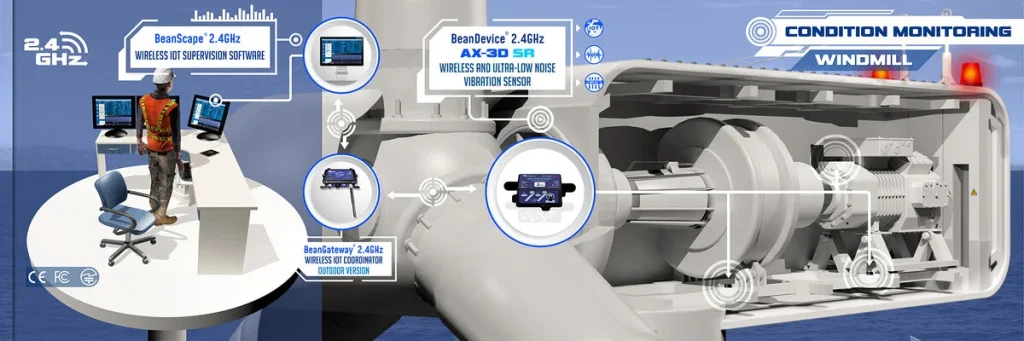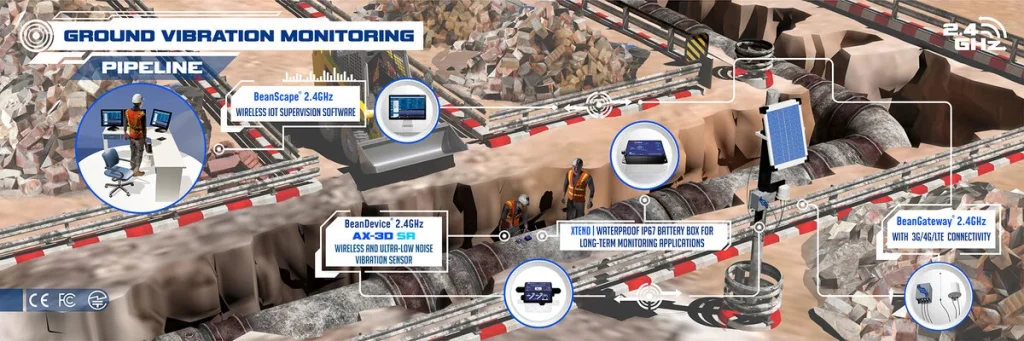 - Gestión centralizada: gracias al coordinador BeanGateway (disponible en versiones de interior y exterior con conectividad 3G/4G/LTE), puedes gestionar todos los nodos y volcar los datos al software de supervisión BeanScape, que incluye herramientas avanzadas de análisis de vibraciones en tiempo real (FFT, velocidad pico de partícula – PPV).